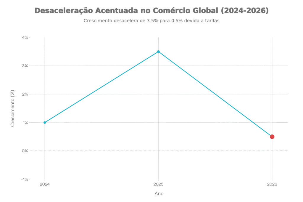 Descrição: Projeção de crescimento do comércio global (2024–2026), destacando a desaceleração para cerca de 0,5% em 2026 segundo a OMC.